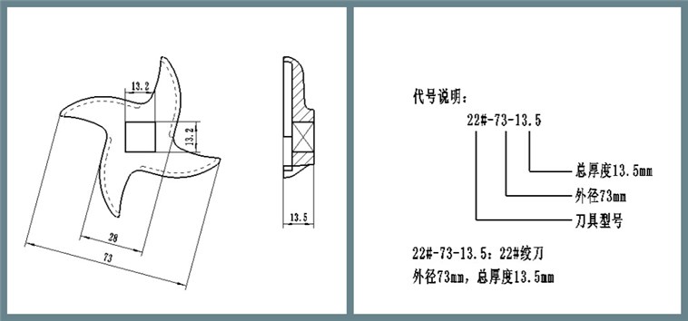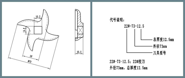 【產品簡介】: 適用于22#絞肉機用風車鉸刀,均采用不銹工具鋼或Cr12MoV等鍛造毛坯,數控設備和專用工裝加工,成熟的熱處理工藝,產品美觀,不生銹、不斷裂、刀刃鋒利、耐磨損、使用壽命長。型號齊全,也可根據客戶提供的機型、圖紙或實物制作。